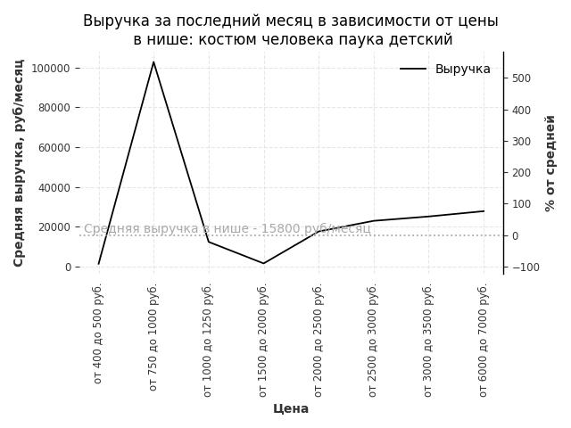 Средняя выручка в нише - 15800 руб./месяц. Максимальная выручка 102900 руб./месяц, на 550% больше среднего в нише, была при цене от 750 до 1000 руб. руб.