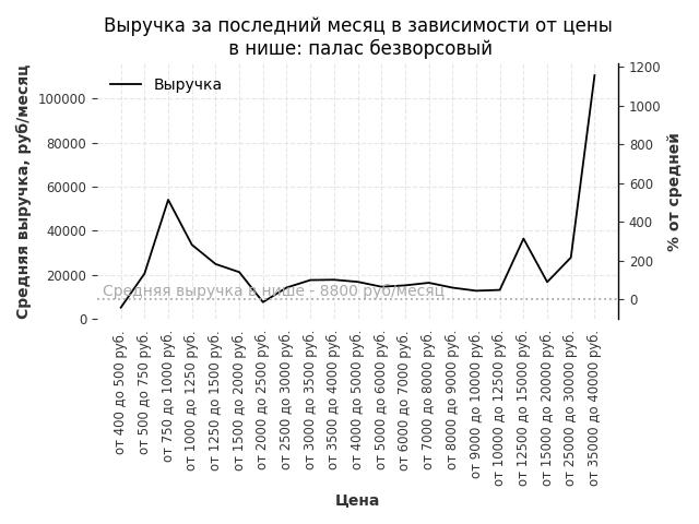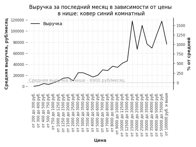 Средняя выручка в нише - 8800 руб./месяц. Максимальная выручка 110600 руб./месяц, на 1160% больше среднего в нише, была при цене от 35000 до 40000 руб. руб.