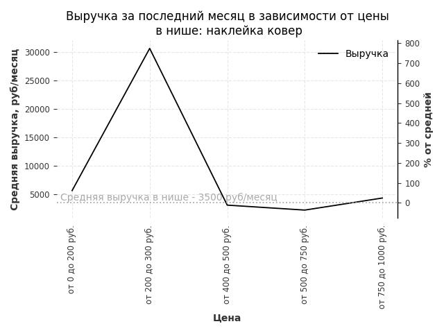 Средняя выручка в нише - 3500 руб./месяц. Максимальная выручка 30600 руб./месяц, на 770% больше среднего в нише, была при цене от 200 до 300 руб. руб.