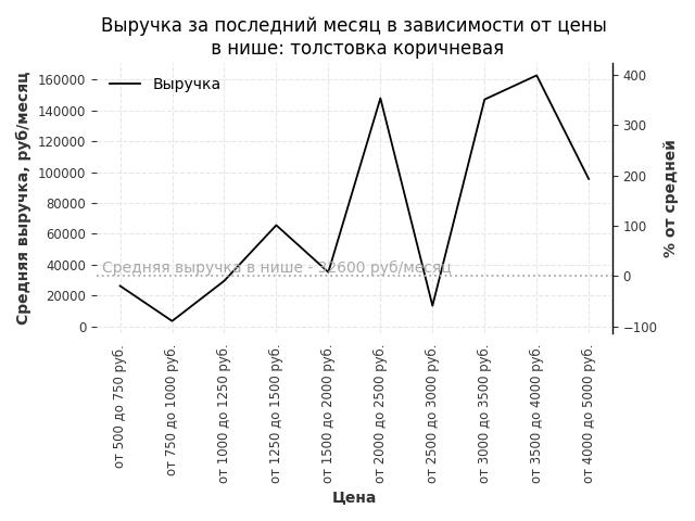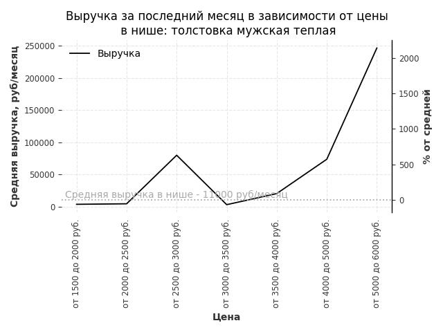 Средняя выручка в нише - 32600 руб./месяц. Максимальная выручка 162800 руб./месяц, на 400% больше среднего в нише, была при цене от 3500 до 4000 руб. руб.
