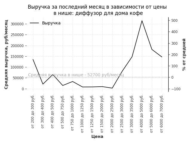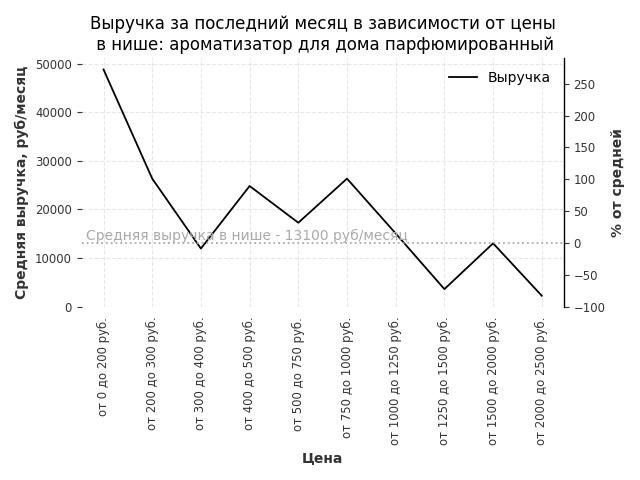Средняя выручка в нише - 52700 руб./месяц. Максимальная выручка 314500 руб./месяц, на 500% больше среднего в нише, была при цене от 4000 до 5000 руб. руб.