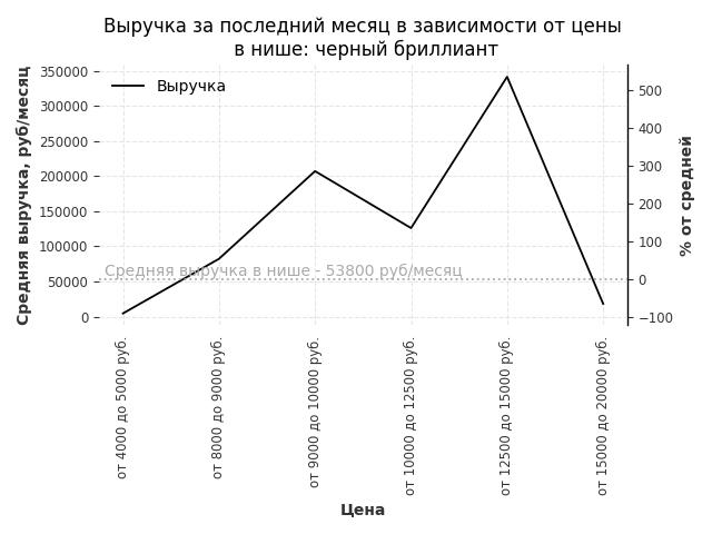 Средняя выручка в нише - 53800 руб./месяц. Максимальная выручка 341300 руб./месяц, на 530% больше среднего в нише, была при цене от 12500 до 15000 руб. руб.