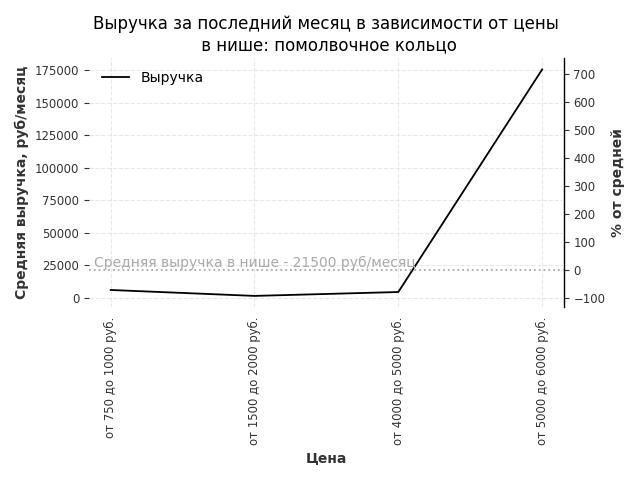 Средняя выручка в нише - 21500 руб./месяц. Максимальная выручка 175400 руб./месяц, на 720% больше среднего в нише, была при цене от 5000 до 6000 руб. руб.