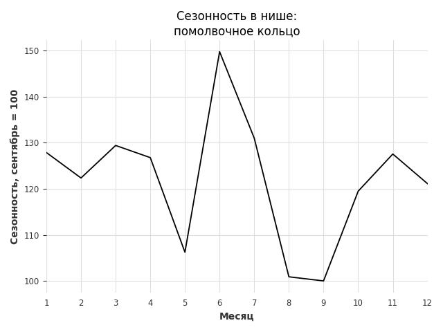 Сезонность в нише средняя. Пик сезонных продаж в нише - октябрь. В ближайшие месяцы можно ожидать сезонного роста продаж до 69%.