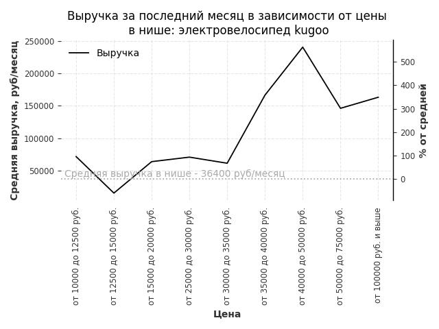 Средняя выручка в нише - 36400 руб./месяц. Максимальная выручка 241100 руб./месяц, на 560% больше среднего в нише, была при цене от 40000 до 50000 руб. руб.