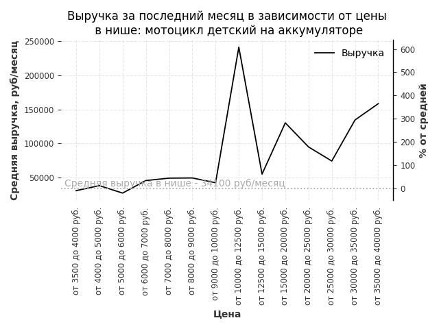 Средняя выручка в нише - 34100 руб./месяц. Максимальная выручка 241500 руб./месяц, на 610% больше среднего в нише, была при цене от 10000 до 12500 руб. руб.