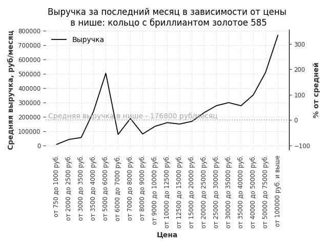 Средняя выручка в нише - 124500 руб./месяц. Максимальная выручка 593600 руб./месяц, на 380% больше среднего в нише, была при цене от 100000 руб. и выше руб.
