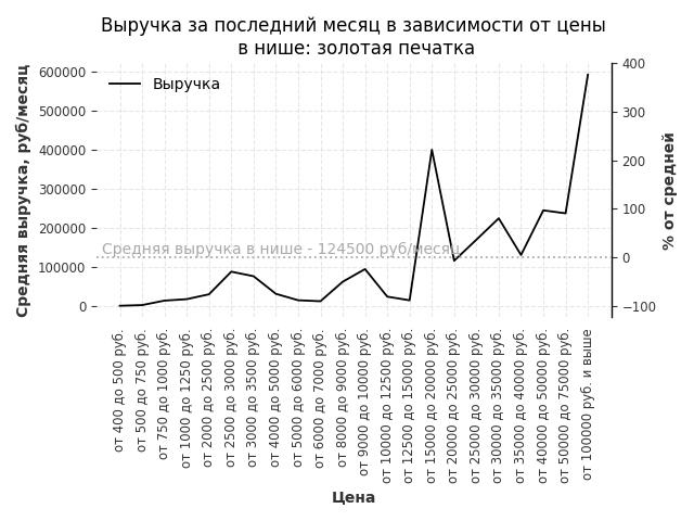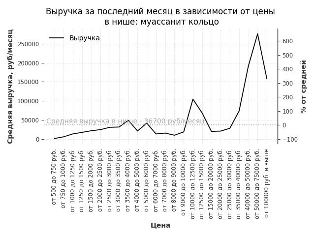 Средняя выручка в нише - 36700 руб./месяц. Максимальная выручка 275700 руб./месяц, на 650% больше среднего в нише, была при цене от 50000 до 75000 руб. руб.
