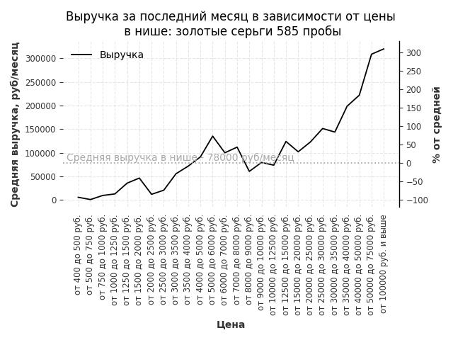 Средняя выручка в нише - 78000 руб./месяц. Максимальная выручка 319800 руб./месяц, на 310% больше среднего в нише, была при цене от 100000 руб. и выше руб.