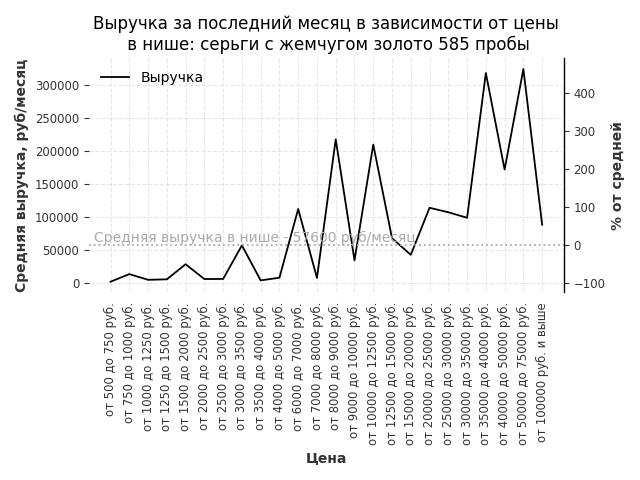 Средняя выручка в нише - 57600 руб./месяц. Максимальная выручка 324300 руб./месяц, на 460% больше среднего в нише, была при цене от 50000 до 75000 руб. руб.