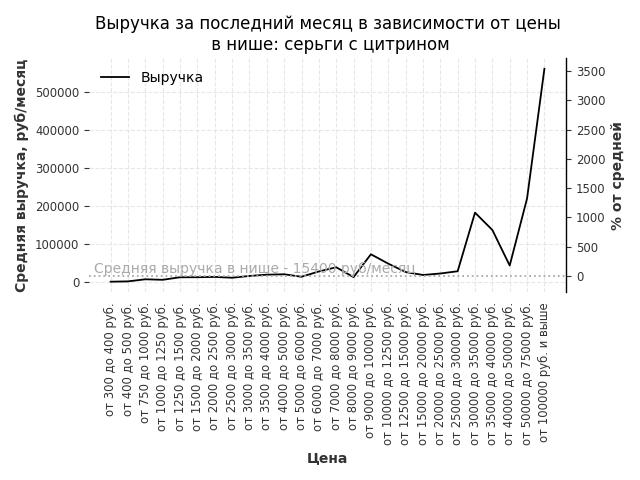 Средняя выручка в нише - 15400 руб./месяц. Максимальная выручка 560000 руб./месяц, на 3540% больше среднего в нише, была при цене от 100000 руб. и выше руб.