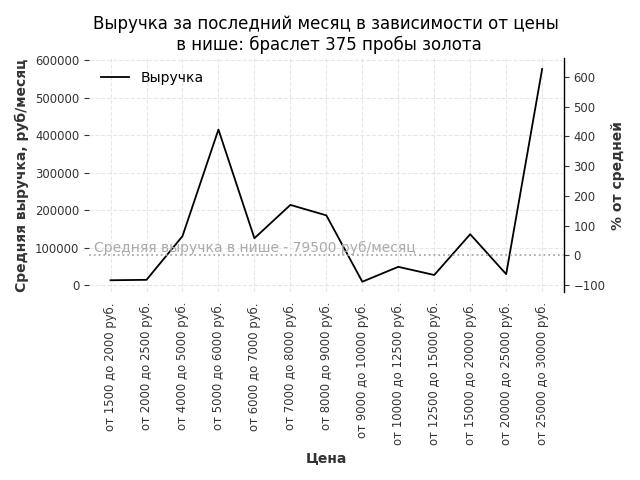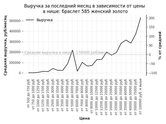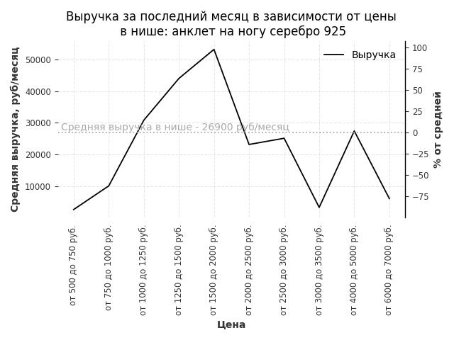 Средняя выручка в нише - 79500 руб./месяц. Максимальная выручка 577100 руб./месяц, на 630% больше среднего в нише, была при цене от 25000 до 30000 руб. руб.