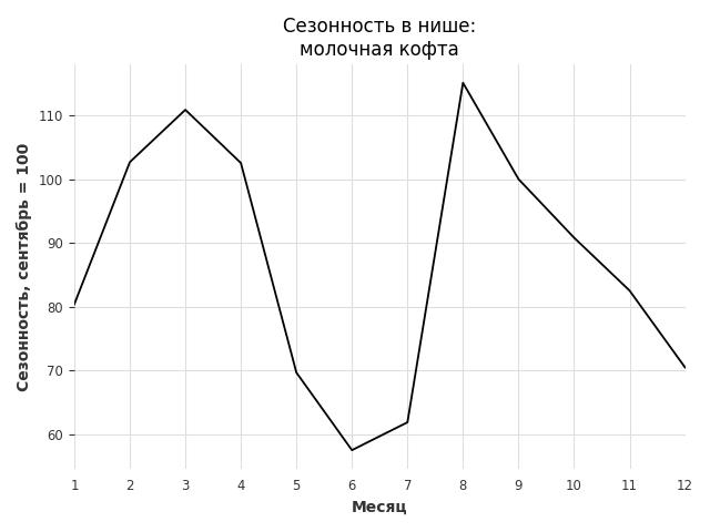 Сезонность в нише слабая. Пик сезонных продаж в нише - сентябрь. В ближайшие месяцы можно ожидать сезонного спада продаж до 18%.