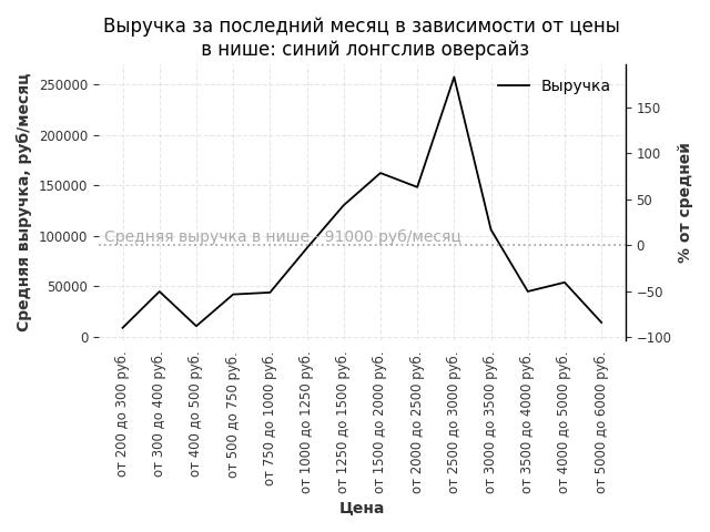 Средняя выручка в нише - 159600 руб./месяц. Максимальная выручка 395100 руб./месяц, на 150% больше среднего в нише, была при цене от 2000 до 2500 руб. руб.