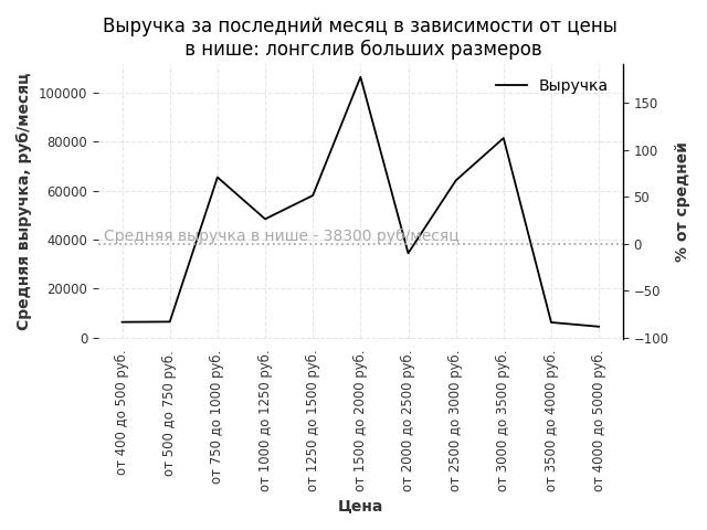 Средняя выручка в нише - 38300 руб./месяц. Максимальная выручка 106400 руб./месяц, на 180% больше среднего в нише, была при цене от 1500 до 2000 руб. руб.
