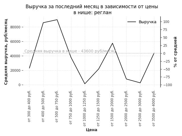 Средняя выручка в нише - 43600 руб./месяц. Максимальная выручка 89900 руб./месяц, на 110% больше среднего в нише, была при цене от 500 до 750 руб. руб.