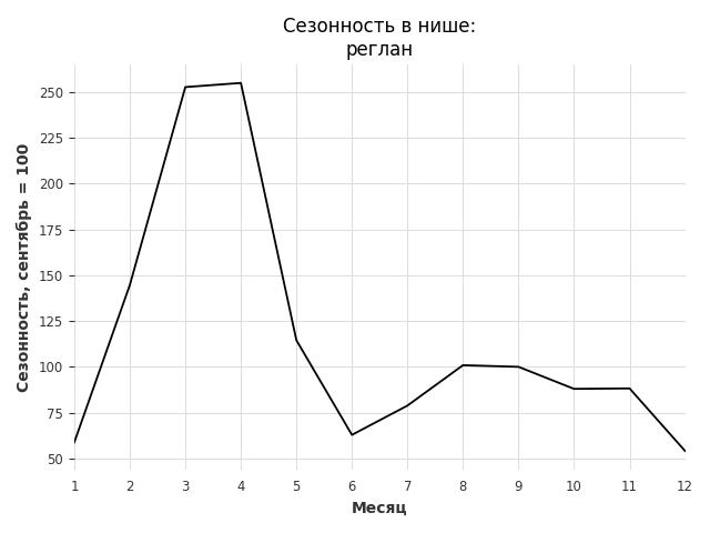 Сезонность в нише сильная. Пик сезонных продаж в нише - апрель. В ближайшие месяцы можно ожидать сезонного спада продаж до 46%.