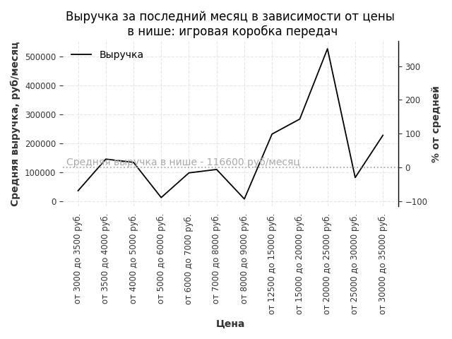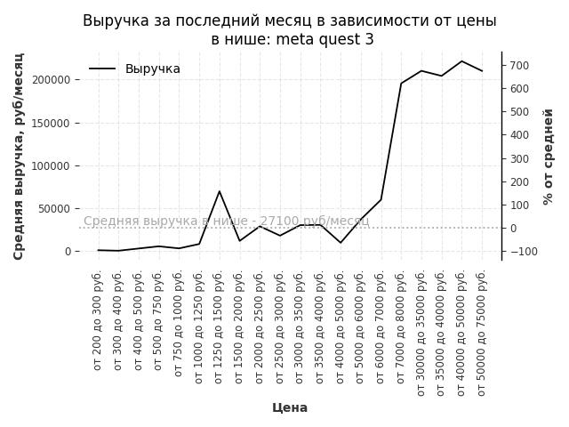Средняя выручка в нише - 27100 руб./месяц. Максимальная выручка 221300 руб./месяц, на 720% больше среднего в нише, была при цене от 40000 до 50000 руб. руб.