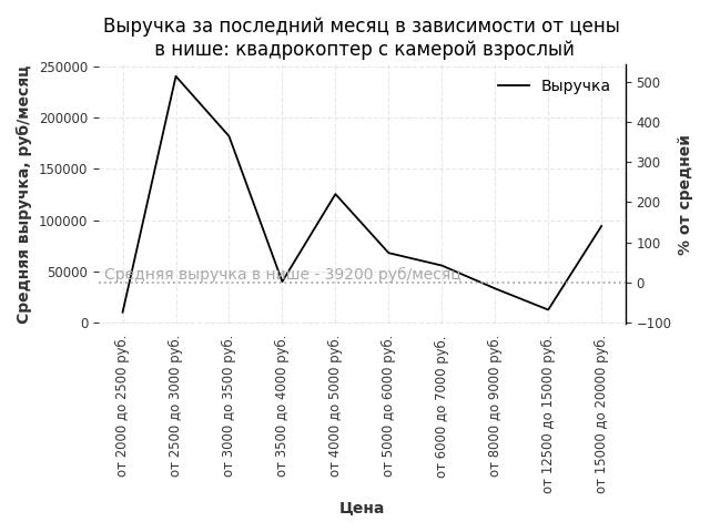 Средняя выручка в нише - 39200 руб./месяц. Максимальная выручка 240400 руб./месяц, на 510% больше среднего в нише, была при цене от 2500 до 3000 руб. руб.