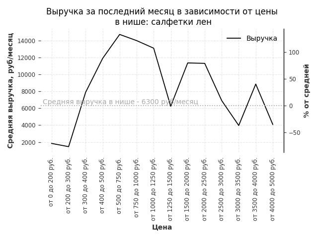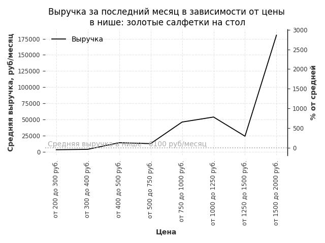 Средняя выручка в нише - 6100 руб./месяц. Максимальная выручка 180600 руб./месяц, на 2860% больше среднего в нише, была при цене от 1500 до 2000 руб. руб.