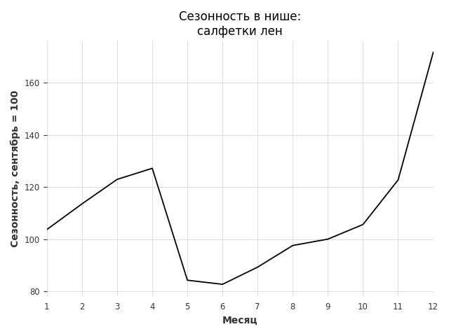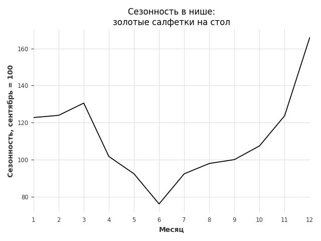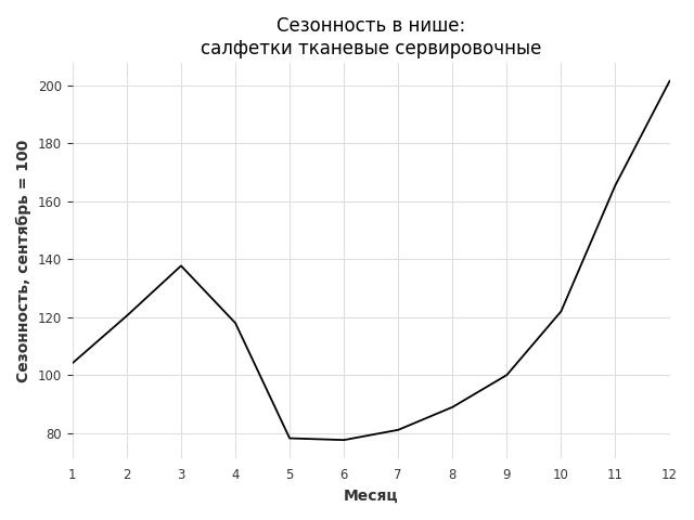 Сезонность в нише средняя. Пик сезонных продаж в нише - декабрь. В ближайшие месяцы можно ожидать сезонного роста продаж до 101%.