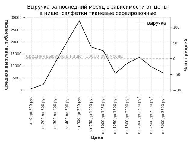 Средняя выручка в нише - 13000 руб./месяц. Максимальная выручка 28600 руб./месяц, на 120% больше среднего в нише, была при цене от 500 до 750 руб. руб.
