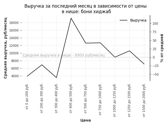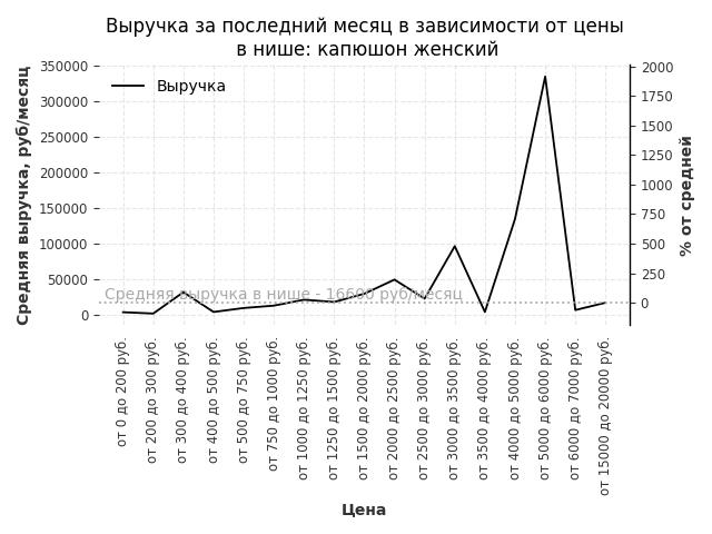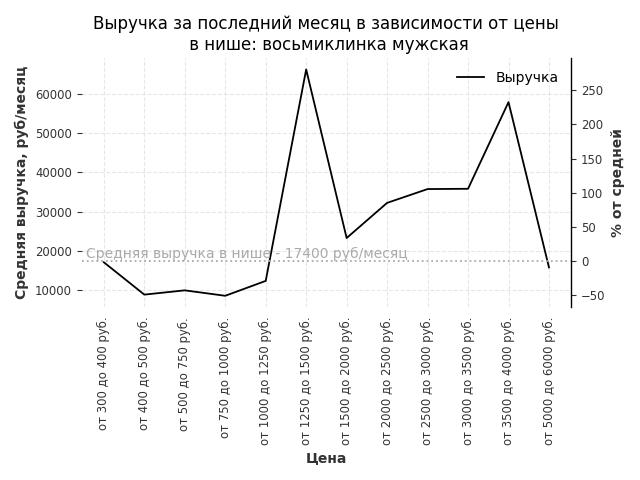 Средняя выручка в нише - 17400 руб./месяц. Максимальная выручка 66100 руб./месяц, на 280% больше среднего в нише, была при цене от 1250 до 1500 руб. руб.