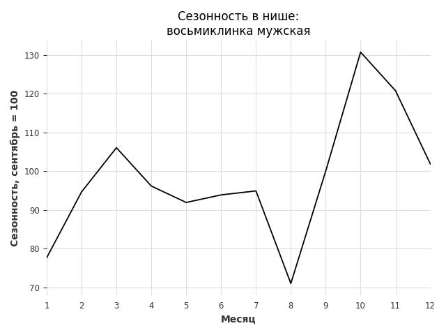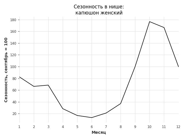 Сезонность в нише сильная. Пик сезонных продаж в нише - октябрь. В ближайшие месяцы можно ожидать сезонного роста продаж до 76%.