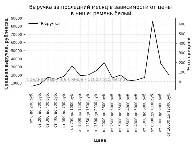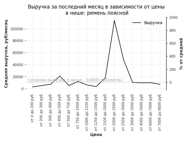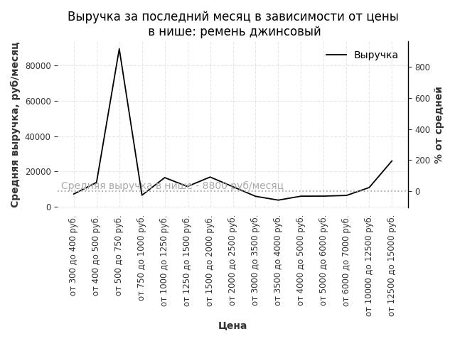 Средняя выручка в нише - 11800 руб./месяц. Максимальная выручка 86100 руб./месяц, на 630% больше среднего в нише, была при цене от 6000 до 7000 руб. руб.