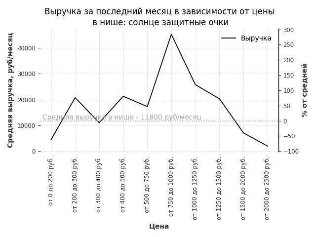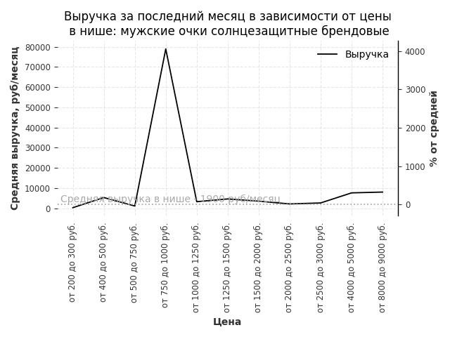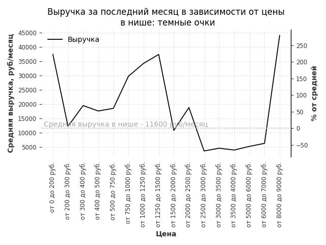 Средняя выручка в нише - 11600 руб./месяц. Максимальная выручка 44000 руб./месяц, на 280% больше среднего в нише, была при цене от 8000 до 9000 руб. руб.