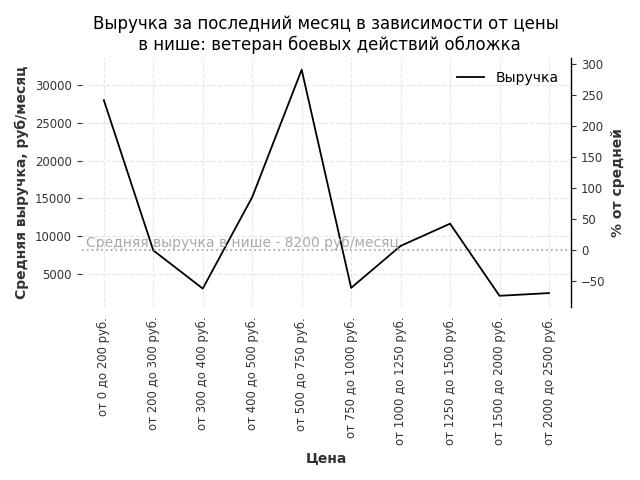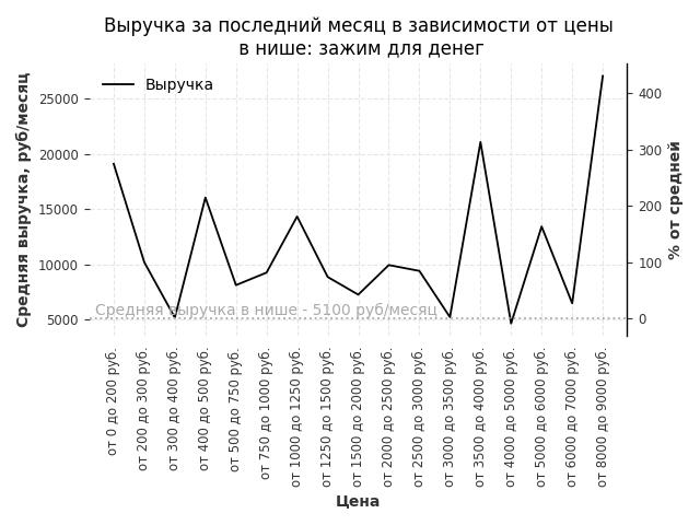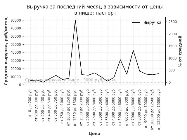 Средняя выручка в нише - 3000 руб./месяц. Максимальная выручка 80000 руб./месяц, на 2570% больше среднего в нише, была при цене от 1250 до 1500 руб. руб.