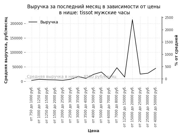 Средняя выручка в нише - 8500 руб./месяц. Максимальная выручка 212900 руб./месяц, на 2400% больше среднего в нише, была при цене от 15000 до 20000 руб. руб.