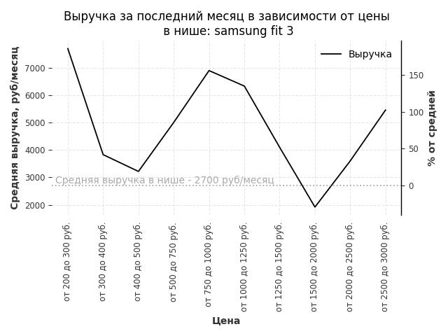 Средняя выручка в нише - 2700 руб./месяц. Максимальная выручка 7700 руб./месяц, на 190% больше среднего в нише, была при цене от 200 до 300 руб. руб.