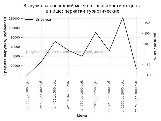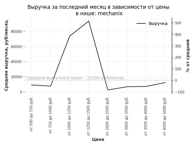Средняя выручка в нише - 44300 руб./месяц. Максимальная выручка 121900 руб./месяц, на 180% больше среднего в нише, была при цене от 1500 до 2000 руб. руб.