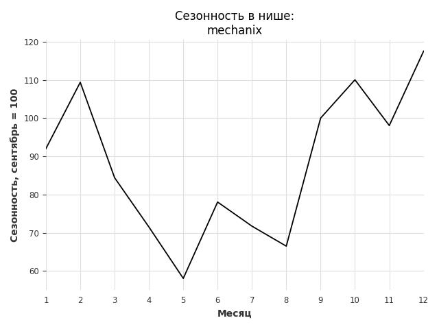 Сезонность в нише средняя. Пик сезонных продаж в нише - декабрь. В ближайшие месяцы сезонность не будет заметно влиять на продажи.
