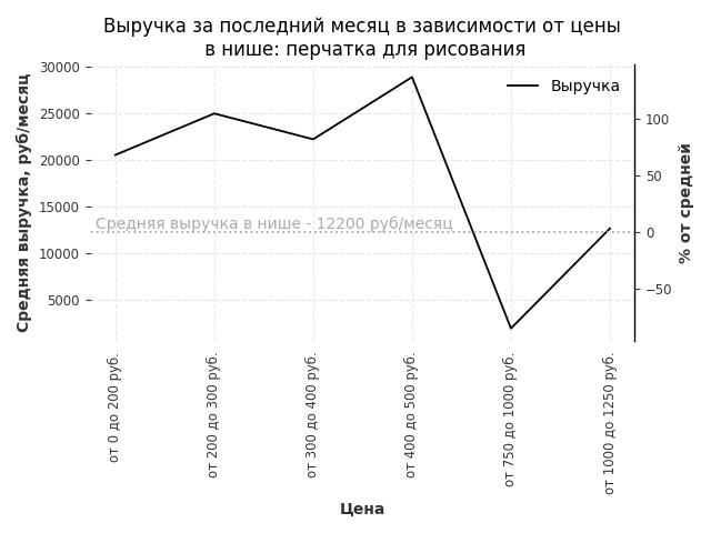 Средняя выручка в нише - 15200 руб./месяц. Максимальная выручка 93400 руб./месяц, на 510% больше среднего в нише, была при цене от 1250 до 1500 руб. руб.
