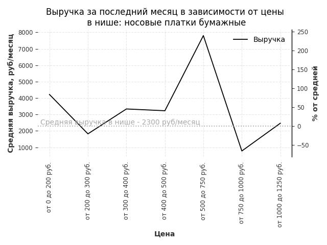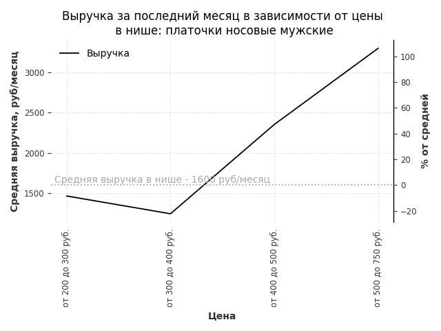 Средняя выручка в нише - 2300 руб./месяц. Максимальная выручка 7800 руб./месяц, на 240% больше среднего в нише, была при цене от 500 до 750 руб. руб.