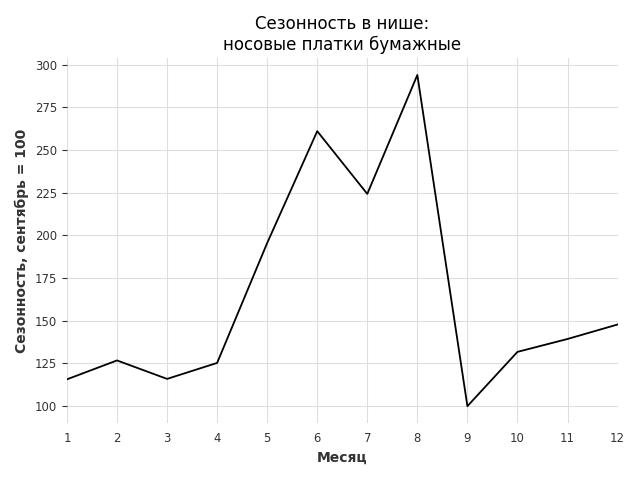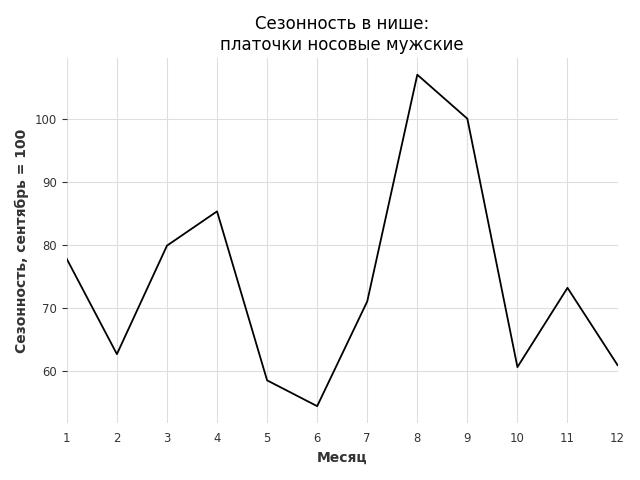 Сезонность в нише слабая. Пик сезонных продаж в нише - август. В ближайшие месяцы можно ожидать сезонного спада продаж до 40%.