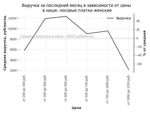 Средняя выручка в нише - 8200 руб./месяц. Максимальная выручка 12300 руб./месяц, на 50% больше среднего в нише, была при цене от 400 до 500 руб. руб.