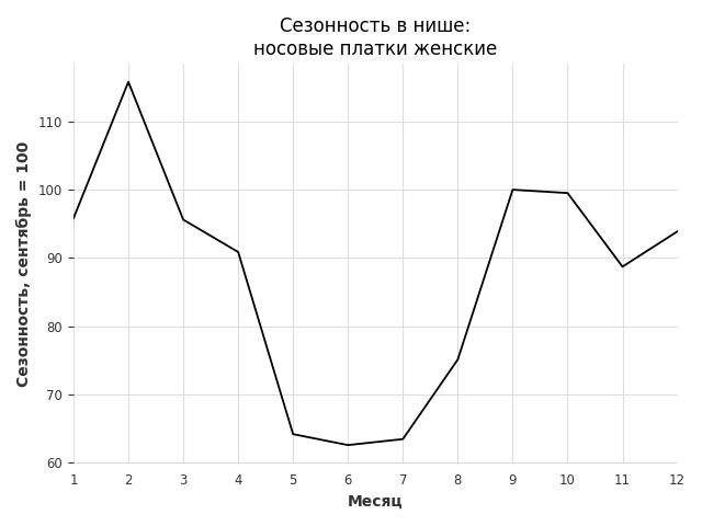 Сезонность в нише слабая. Пик сезонных продаж в нише - февраль. В ближайшие месяцы сезонность не будет заметно влиять на продажи.